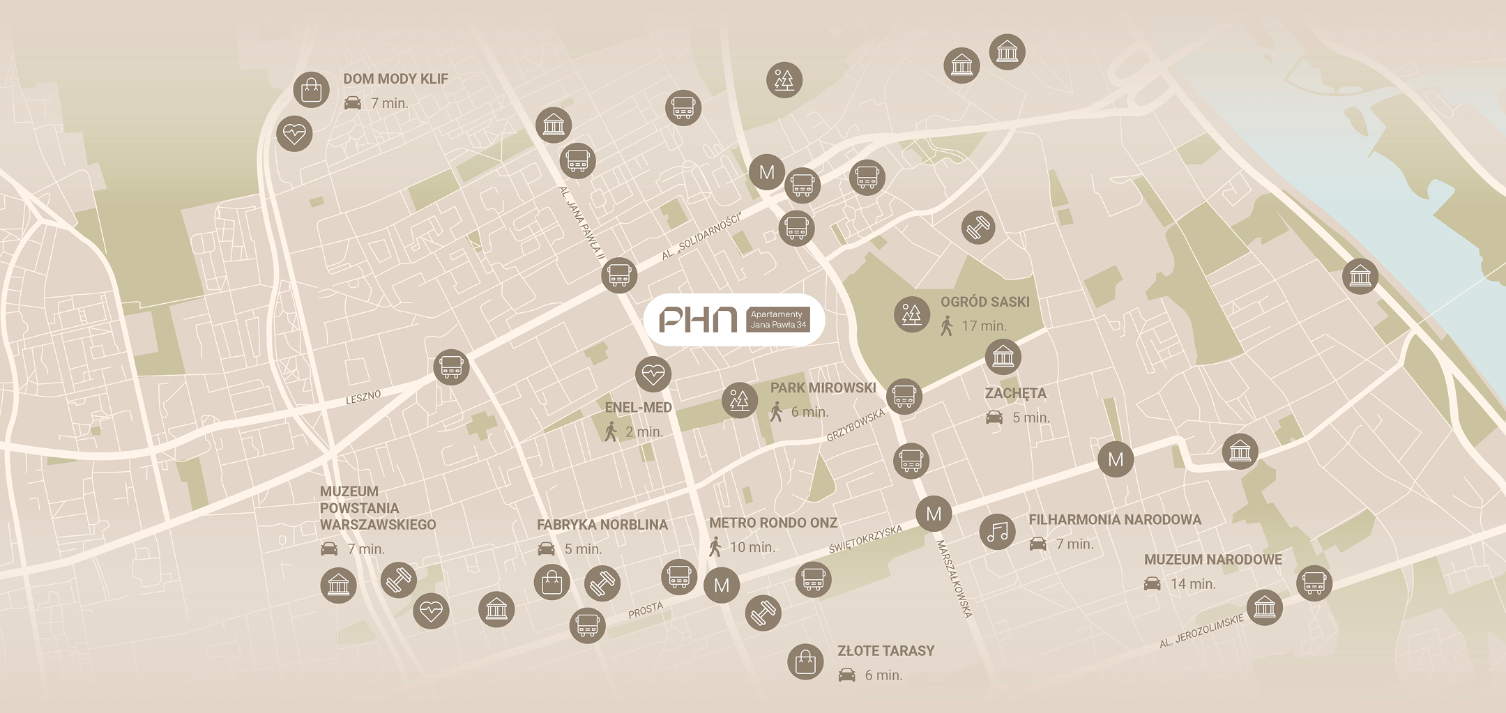 Lokalizacja przy al. Jana Pawła II 34 to kwintesencja miejskiego życia. Inwestycja znajduje się w bezpośrednim sąsiedztwie najważniejszych punktów kulturalnych, usługowych i biznesowych Warszawy. Liczne linie tramwajowe oraz autobusowe umożliwiają szybki dostęp do wszystkich kluczowych obszarów miasta. To miejsce, gdzie puls stolicy bije najmocniej, a jednocześnie jest to przestrzeń, która zapewnia spokój i prywatność. Doskonale skomunikowana z resztą miasta lokalizacja, sprawia, że wszystko czego potrzebujesz, znajduje się na wyciągnięcie ręki – od prestiżowych restauracji, przez galerie sztuki, po nowoczesne biurowce.